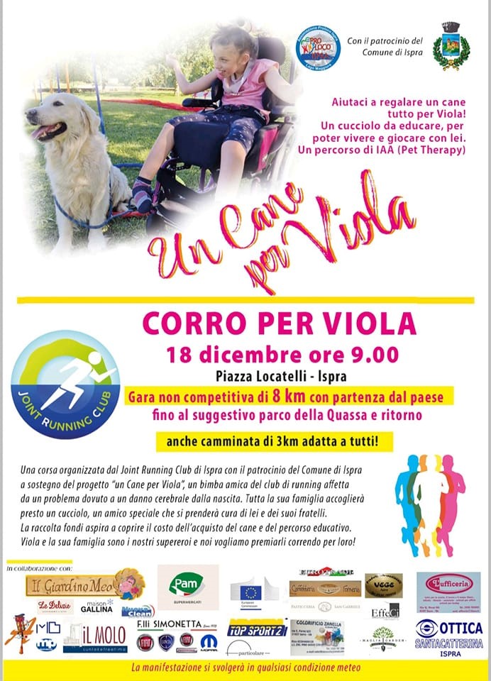 Il Joint Running Club ha organizzato la gara “Corro per Viola” il 18 dicembre 2022, a Ispra, con l’obiettivo di sostenere il progetto “Un Cane per Viola”. Viola è una bambina amica del Club, affetta da un grave problema neurologico dovuto a un danno cerebrale congenito.